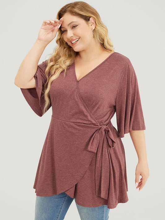 Plain Flutter Sleeve Knot Side Wrap T-shirt