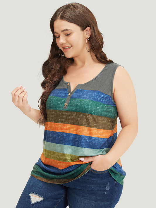 Rainbow Striped Notched Button Detail Arc Hem Tank Top