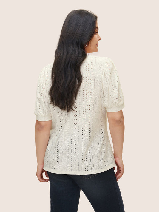 Solid Notched Broderie Anglaise Lantern Sleeve T-shirt