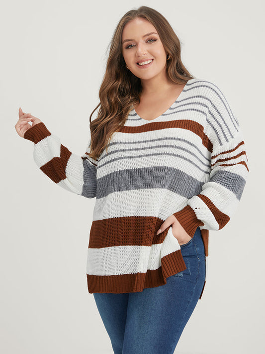 Striped Contrast Pointelle Knit Split Hem Knit Top