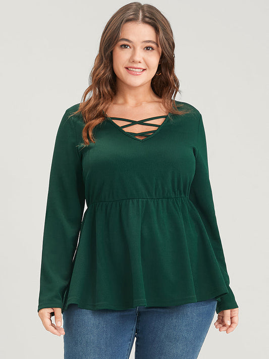 Solid Crisscross V Neck Flutter Hem Long Tee