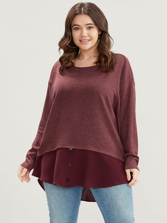 Solid Patchwork Round Neck Asymmetrical Hem Long Tee
