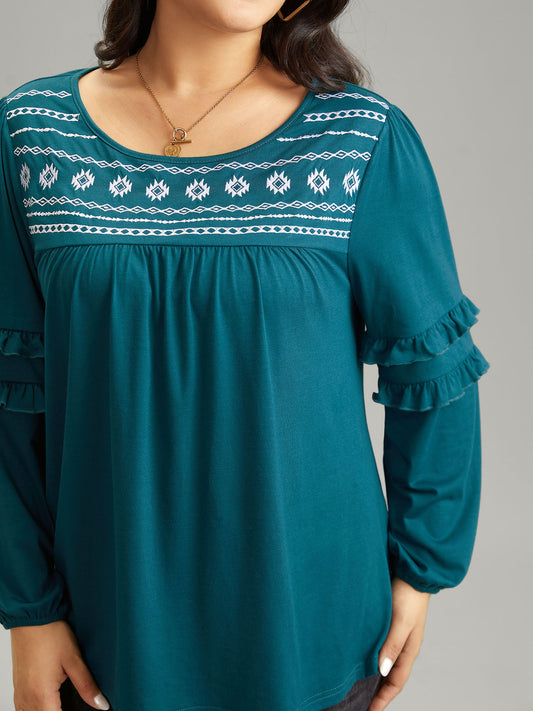 Boho Print Embroidered Ruffle Trim Gathered T-shirt