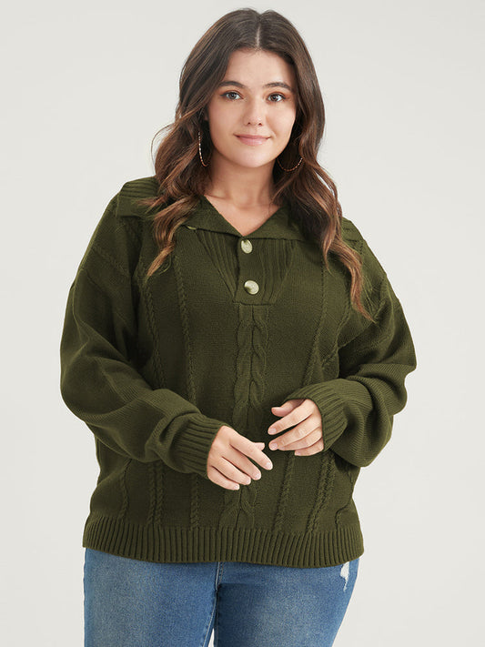 Solid Pointelle Knit Button Lapel Collar Cable Knit Top
