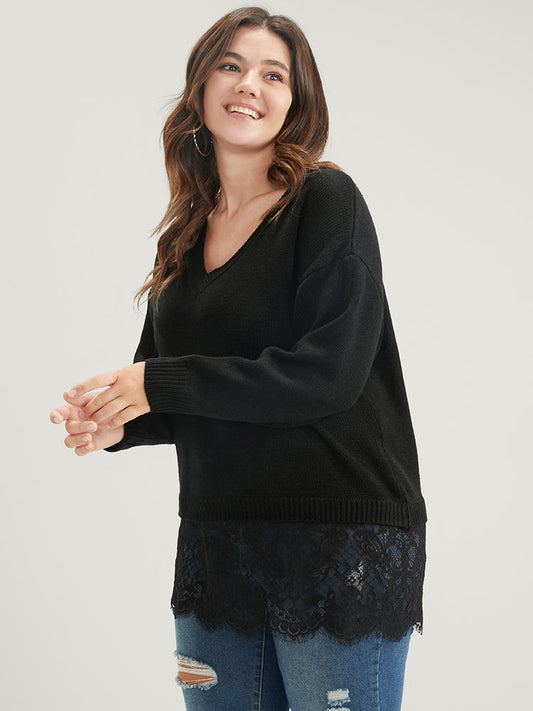 Solid Pointelle Knit V Neck Lace Hem Knit Top