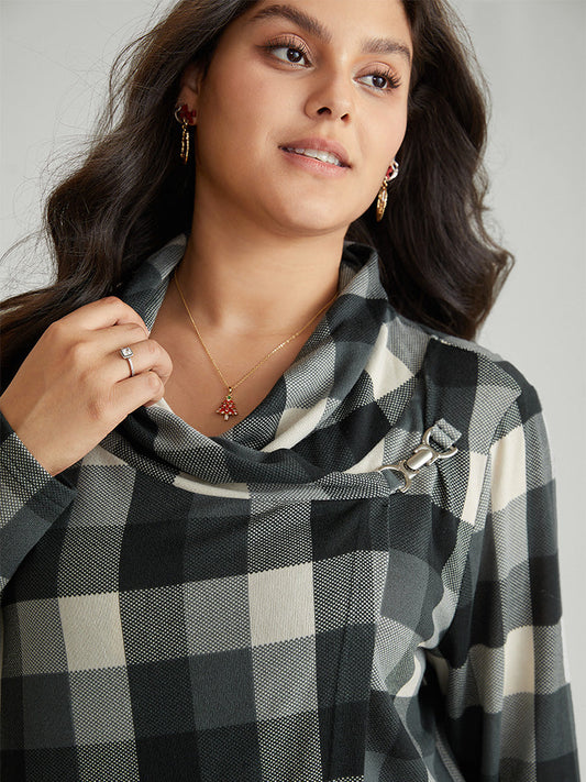 Plaid Cowl Neck Wrap Asymmetrical Hem T-shirt