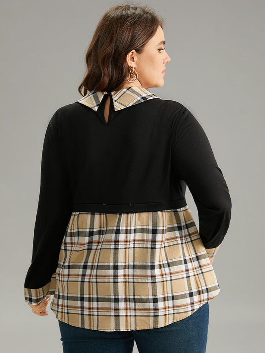 Plaid Patchwork Button Detail Lapel Collar T-shirt