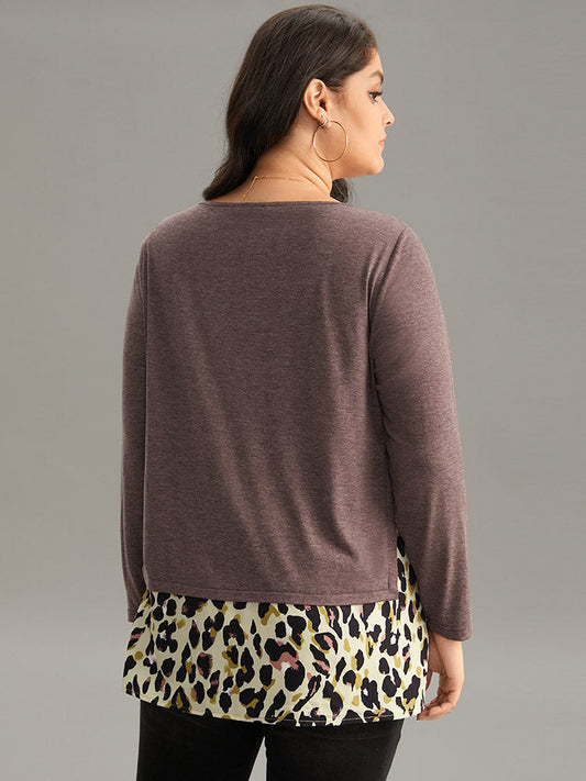Leopard Patchwork Contrast Crew Neck Knit T-shirt