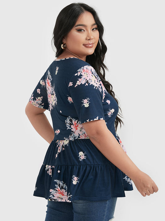 Floral Print Crisscross V Neck Babydoll T-shirt