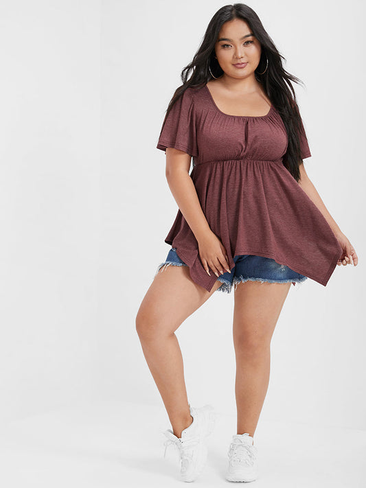 Plain Ruffled Geometric Cut Out V Neck T-shirt