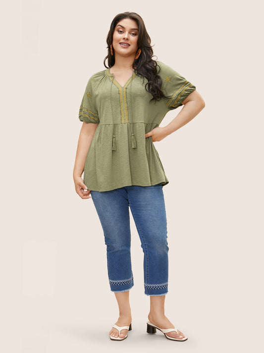 Embroidered Tie Knot Tassels Gathered T-shirt