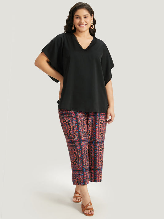 Plain Contrast Lace Flutter Sleeve Woven Top