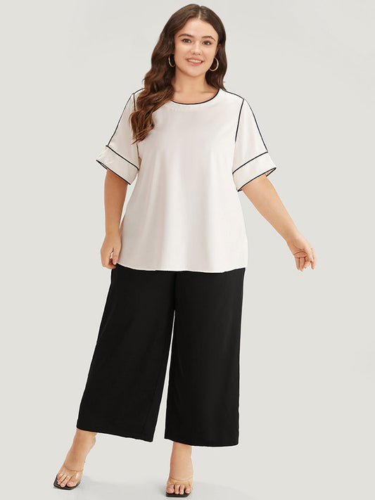 Anti-Wrinkle Solid Keyhole Roll Sleeve Metal Detail Woven Top