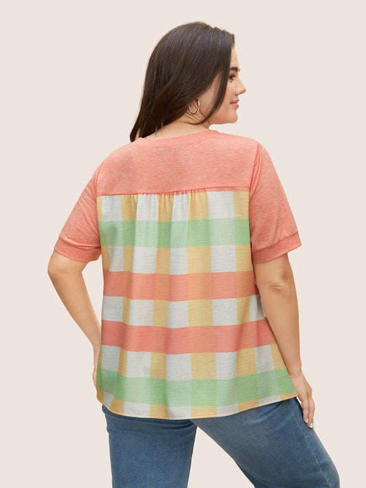 Crew Neck Colored Plaid Patchwork Gathered T-shirt