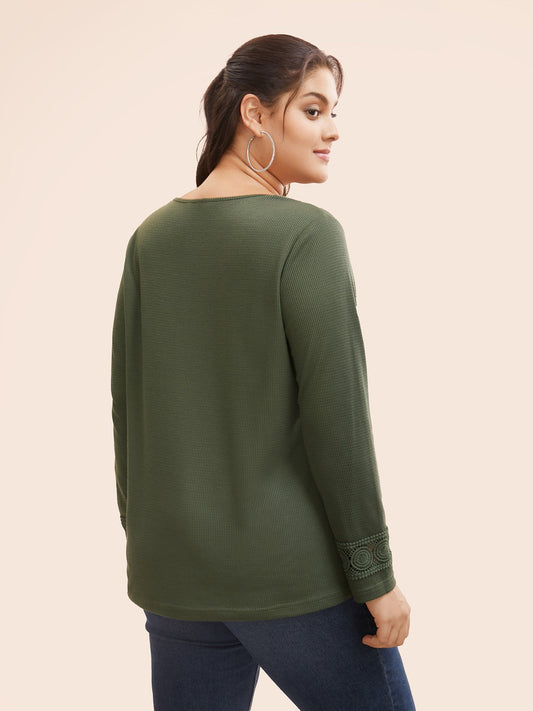 V Neck Waffle Knit Lace Patchwork T-shirt