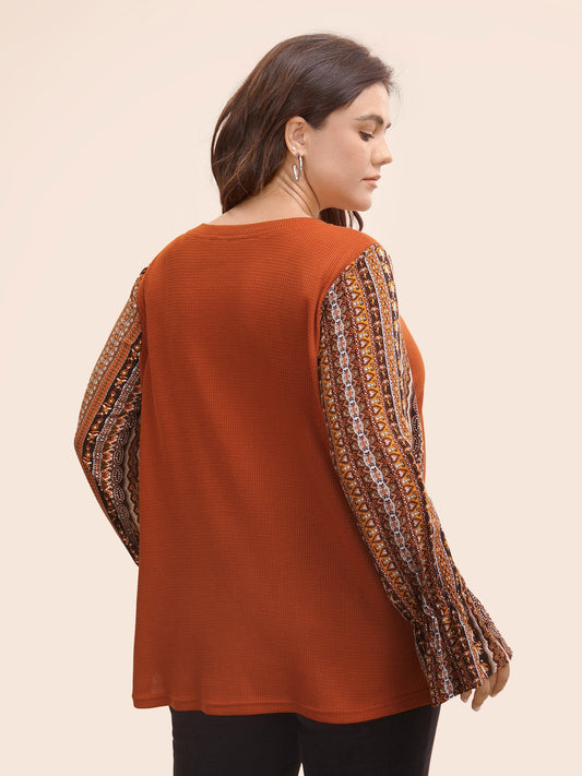Bandana Patchwork Waffle Knit Lantern Sleeve T-shirt