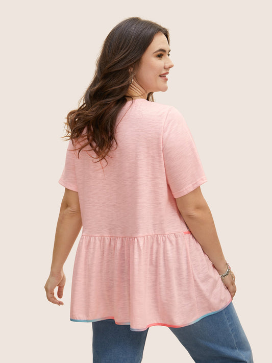 Round Neck Contrast Tucked Seam Ruffles T-shirt