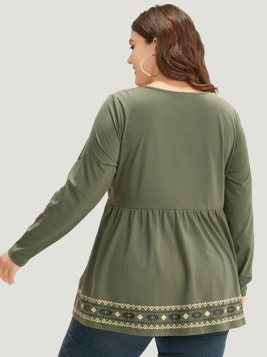 Boho Print Broderie Anglaise Gathered Crew Neck T-shirt
