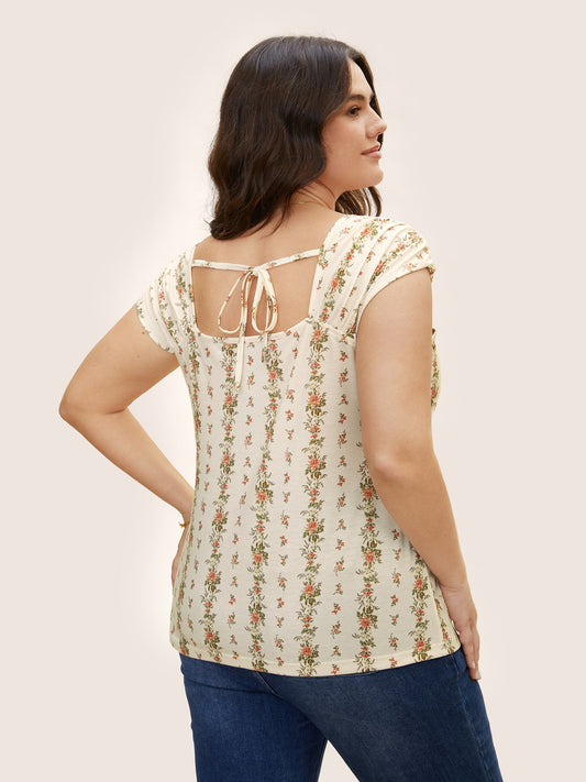 Square Neck Natural Flowers Print Cap Sleeve T-shirt