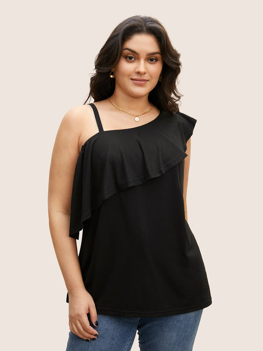 One Shoulder Solid Ruffle Trim T-shirt