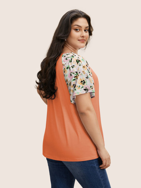 Crew Neck Patchwork Floral Raglan Sleeve T-shirt