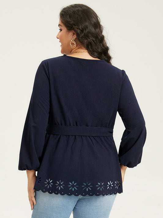 Plain V Neck Belted Wrap Laser Cut T-shirt