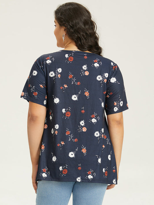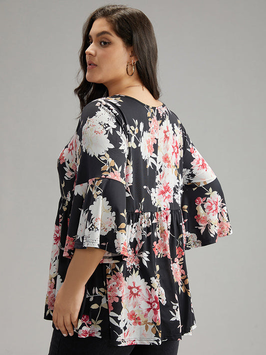 Floral Print V Neck Elastic Waist Flutter Hem T-shirt