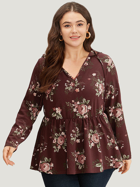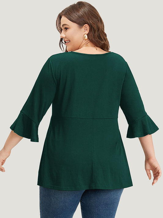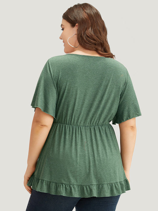 Plain Ruffle Sleeve Wrap Elastic Waist Gathered T-shirt
