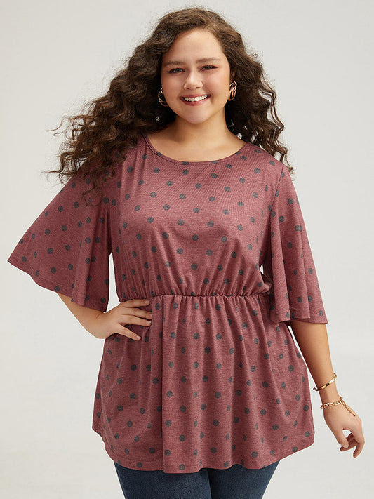 Polka Dot Round Neck Flutter Sleeve Back Crisscross T-shirt