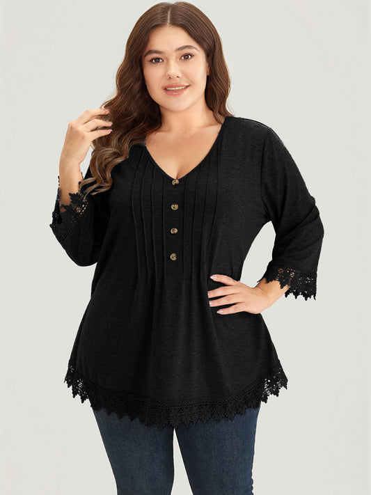 Plain Contrast Lace Crisscross Neck Gathered T-shirt