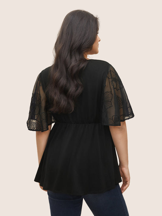 Crochet Lace Mesh Cut Out Ruffle Sleeve Knit Top