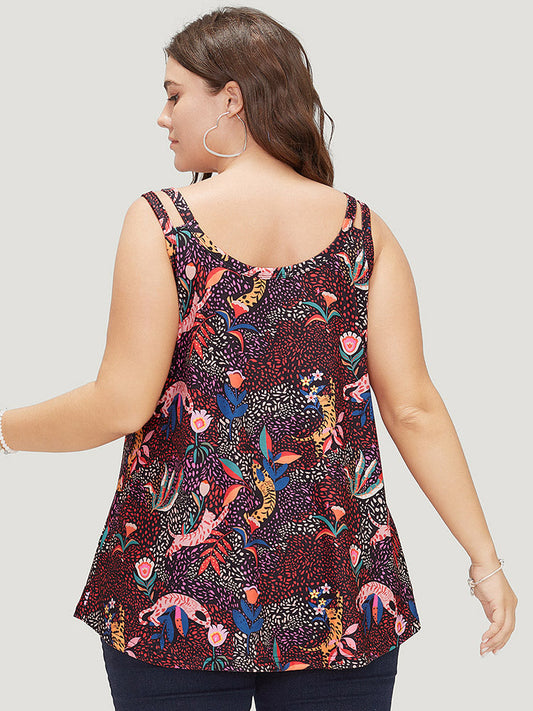 Cat & Plant Print Sleeveless Cut Out Cami Top