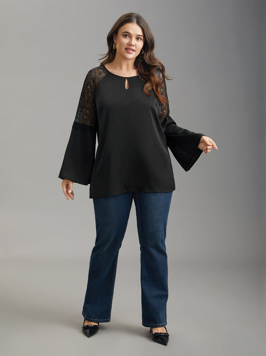 Halloween Crochet Lace Mesh Keyhole Bell Sleeve Woven Blouse