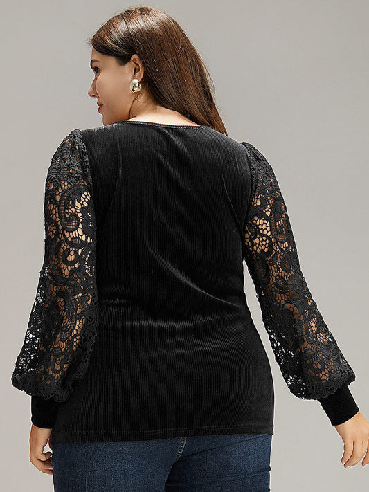 Lace Patchwork Square Neck Lantern Sleeve T-shirt