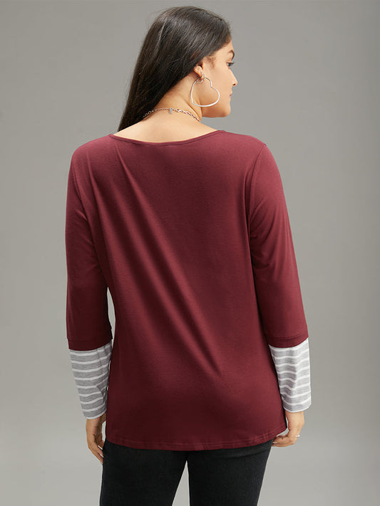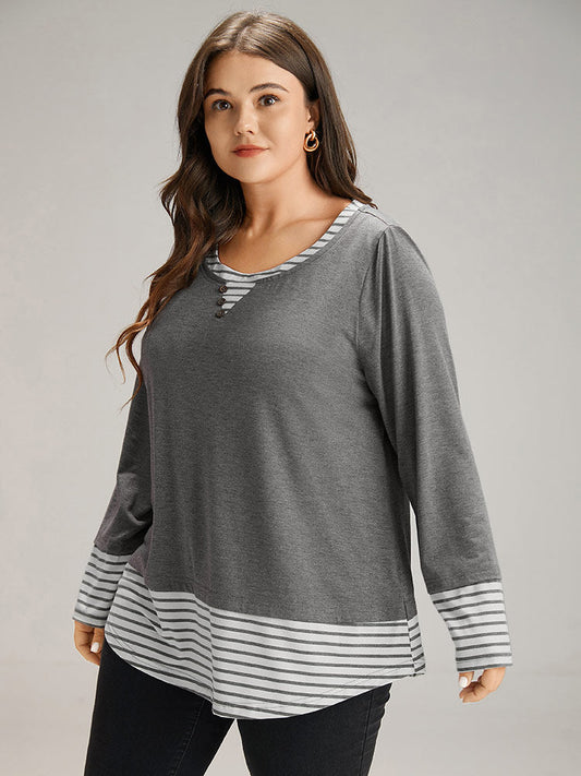 Striped Patchwork Button Detail T-shirt