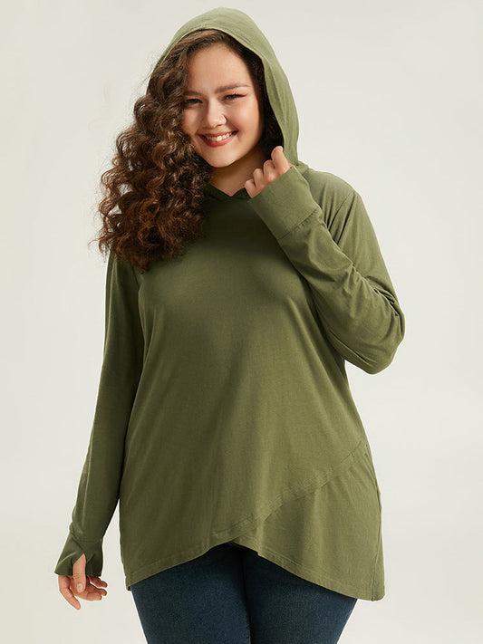 Plain Hooded Wrap Hem Thumb Hole T-shirt