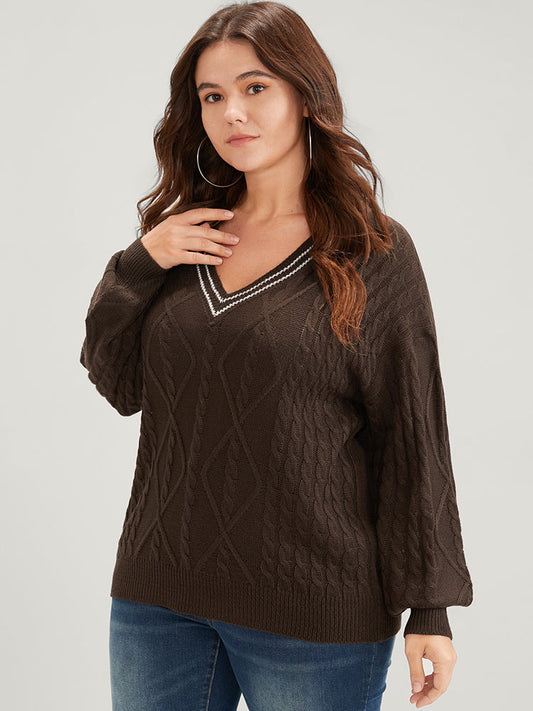 Contrast Trim Pointelle Knit V Neck Lantern Sleeve Knit Top