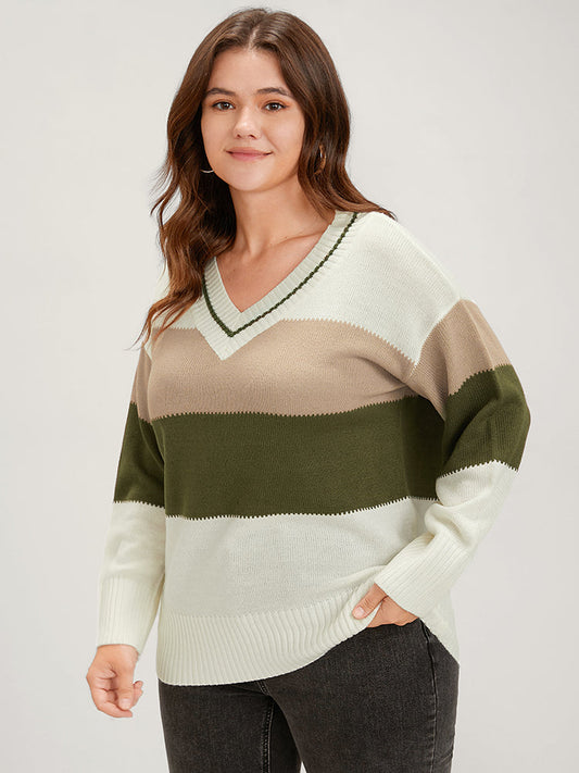 Colorblock Contrast Pointelle Knit V Neck Knit Top