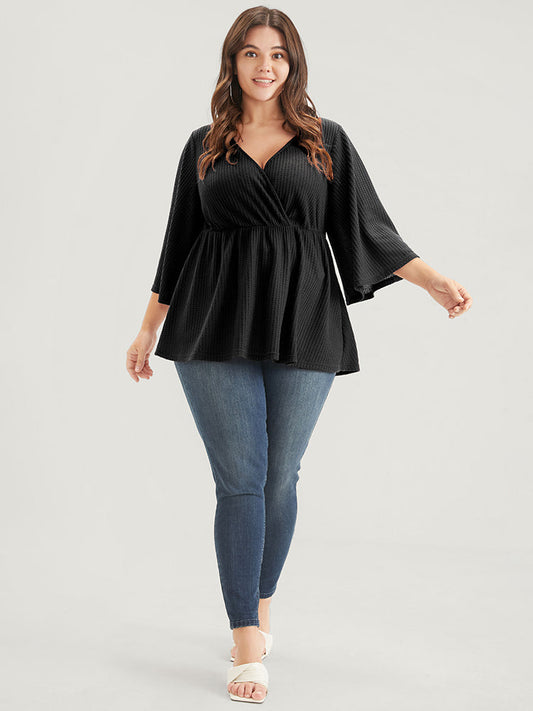 Solid Waffle Knit Flounce Sleeve Ruffles Wrap Tee