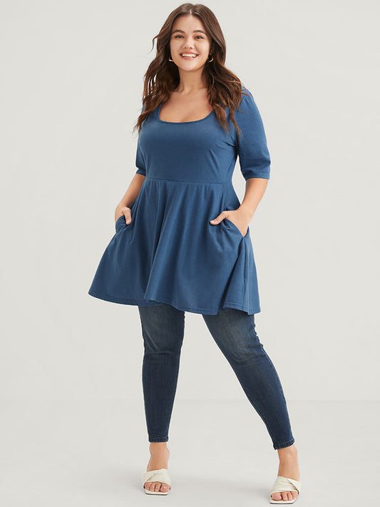 Plain Pocket Flutter Hem Scoop Neck T-shirt
