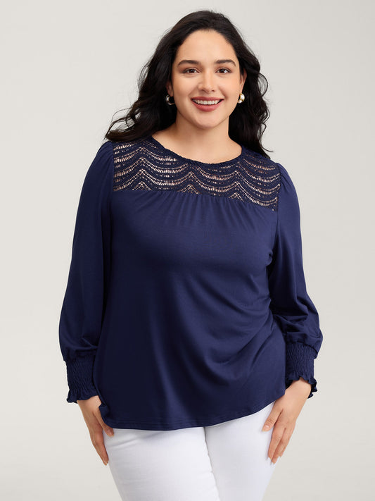 Lace Sheer Neckline Balloon Sleeve Knit Top