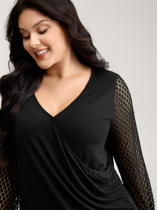 Crossover Draped Lace Sheer Sleeve Knit Top