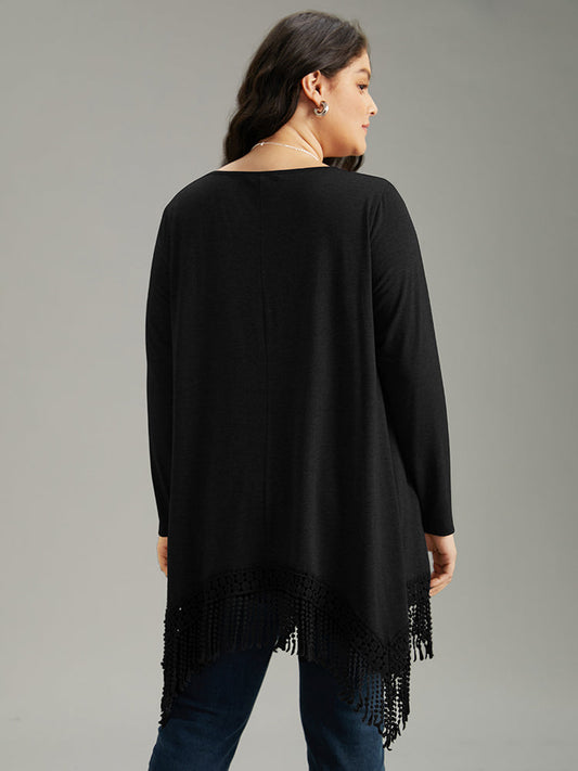 Solid Tassels Trim Pocket Asymmetrical Hem T-shirt