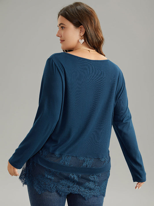 Solid Tunic Crochet Mesh Crew Neck T-shirt