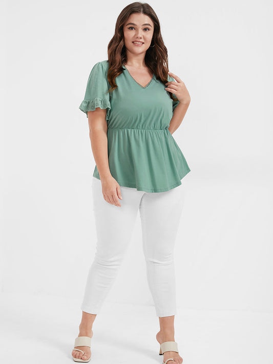Solid Broderie Anglaise Flutter V Neck T-shirt