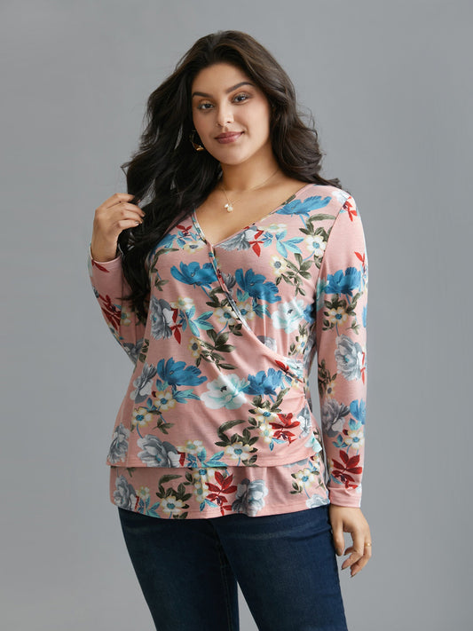 Floral Print Surplice Neck Knit Top