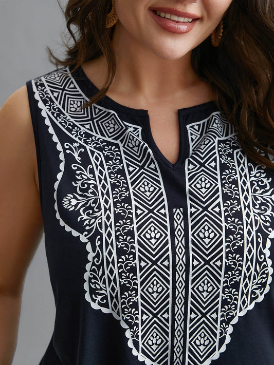 Geometric Printed Notched Collar Slim-Fit Tank Top