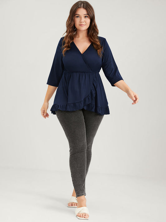Solid Ruffles Trim Button Wrap Modal T-shirt