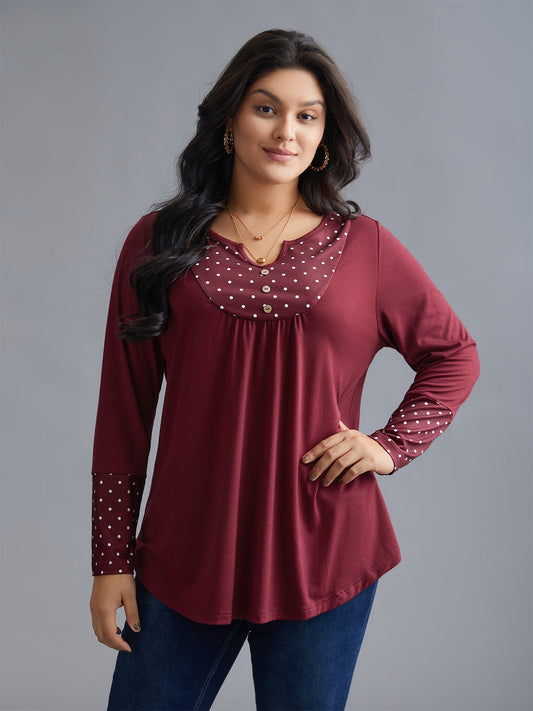Notched Button Detail Polka Dot Patchwork T-shirt