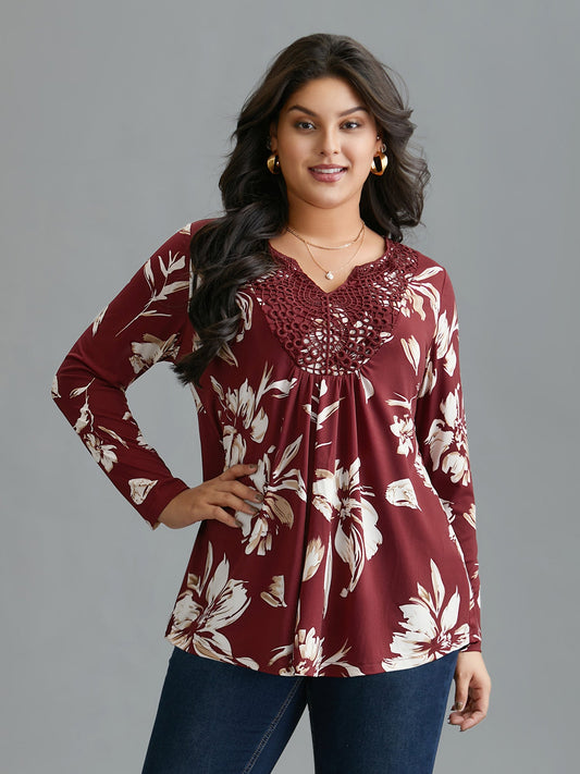 Lace Trim Notched Floral Knit Top